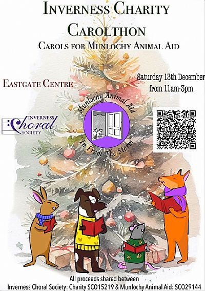 We're so happy to be partnering with local animal charity Munlochy Animal Aid for our 2025 Carolthon. We'll be in the Eastgate Centre, Inverness on Saturday 13th December between 11am and 3pm. We hope you can join us. Thank you to Aspen Eveleigh (16) for designing our poster this year. Aspen is one of MAA's volunteers.