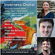 The content of the concert will be Gounod's "Mass for St Cecilia" and Elgar's "From the Bavarian Highlands". The concert will be in Inverness Cathedral on Saturday 22nd November 2025. Our soloists are Sophie Bysouth (Soprano), Austin Smith (Tenor) and Luke Francis (Bass). Advance notice for our Spring 2026 concert, which will be Mendelssohn's Elijah. This will be in the Drummossie Hotel, Inverness on Sunday 19th April 2026. Will you be singing? Will you be in the audience? New or returning members will be welcome when rehearsals begin in January, |